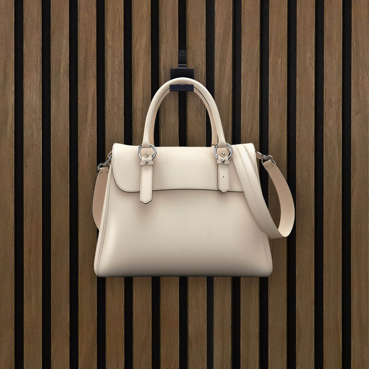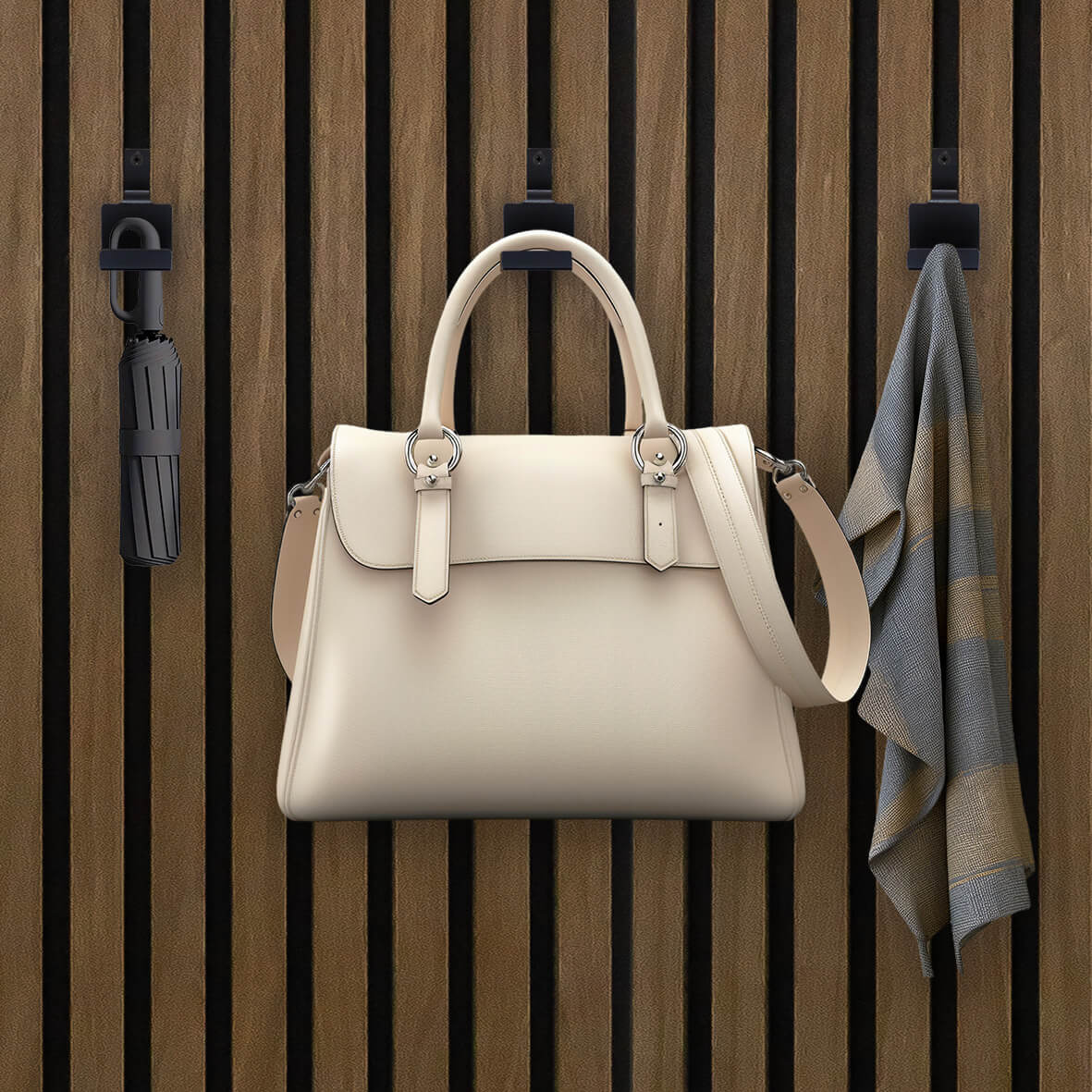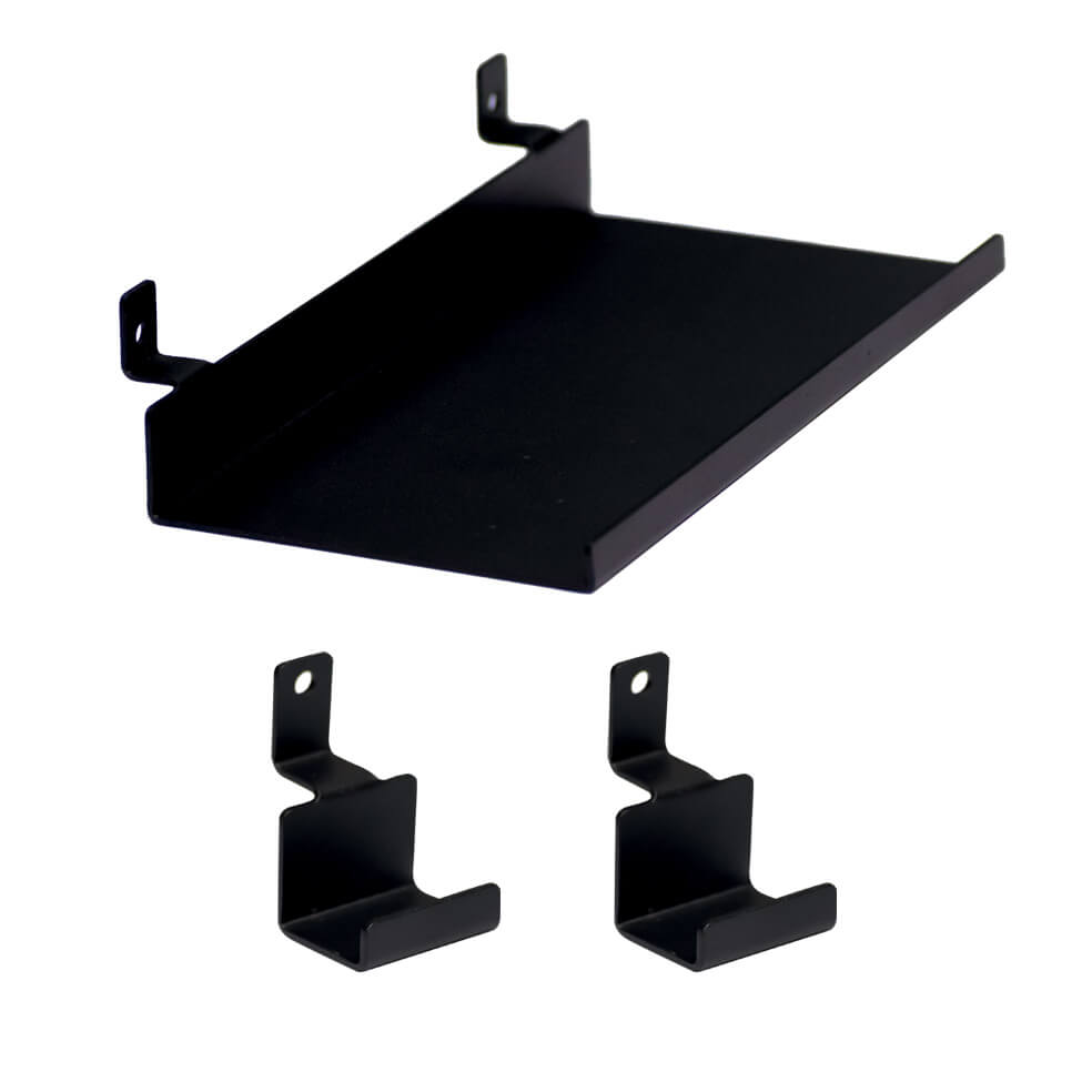 Composto da 2 ganci (che fungono anche da appendini per gli abiti) e una mensola in metallo dal design essenziale, questo kit ti consente di trasformare i tuoi pannelli in una parete attrezzata elegante e funzionale.